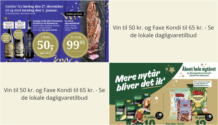 Hos Min Købmand kan du få en ramme med 24 x 33 cl Faxe Kondi eller Pepsi Max for kun 65 kr. pr. ramme. Tilbuddet er gældende fra lørdag den 27. december til og med onsdag den 31. december 2025.